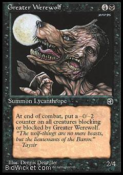 Card Text: At the end of combat, put a -0/-2 counter on all creatures blocking or blocked by Greater Werewolf.